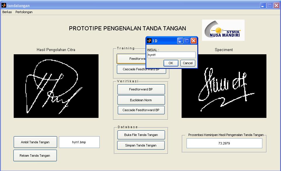 Akhirnya sampai juga tahap testing sistem pengenalan tanda tangan baik dengan feedforward, cascade-forward maupun normal euclidean. Sampel tanda tangan yang dikumpulkan adalah 30 orang (mengikuti kaidah normal pada statistik). Tiap orang menandatangani sebanyak 10 buah tanda tangan, satu untuk ditraining sisanya untuk uji coba.