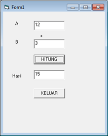 Seperti halnya matematika, untuk menghitung, VB memerlukan variabel, di sini variabel tiap komponen pada form di atas adalah: Text1, Text2, Text3, Command1 dan Command2. Tentu saja kurang baik menurut saya, sebaiknya diubah sesuai dengan fungsinya, misalnya Command1 diganti cmdhitung, Command2 diganti cmdkeluar dan sebagainya, agar pembaca listing dapat mengerti maksud program yang kita buat. Tapi, untuk sekedar contoh, bolehlah kita pakai variable defaultnya saja.
