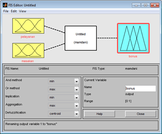 Secara default Matlab menyediakan satu masukan, satu kelauaran dan satu rule bertipe Mamdani. Karena kita diminta untuk membuat dua masukan yaitu pelayanan dan masakan, klik: edit – Add Variable – Klik “input”. Tambahkan pelayanan dan masakan sebagai variabel masukan. Beri nama yang sesuai untuk output, misalnya “bonus”.