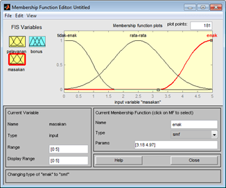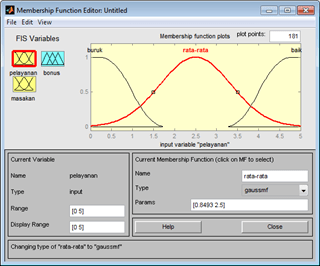 Langkah berikutnya adalah kita membuat fungsi keanggotaan (membership function) untuk input. Misal pelayanan terlebih dahulu, dobel klik pada masukan pelayanan, maka akan muncul jendela baru untuk mengatur fungsi keanggotaan. Yang perlu kita atur adalah nama fungsi keanggotaan, range dan tipe-nya. Nama fungsi keanggotaan pada FIS berupa ciri verbal seperti baik, rata-rata atau buruk. Range menyatakan jangkauan angka misalnya lima menyatakan paling baik, nol menyatakan paling buruk, berarti antara dua dan tiga adalah rata-rata. Coba sendiri membuat fungsi keanggotaan seperti pada gambar di bawah ini. Agar lebih cepat, coba gunakan tipe z, gauss dan s untuk berturut-turut pada fungsi buruk, rata-rata dan baik.