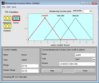 Berikutnya kita merancang fungsi keanggotaan pada variabel keluaran yaitu bonus. Misalnya kita akan mengkategorikan bonus menjadi banyak, rata-rata dan sedikit. Untuk memudahkan, gunakan range penjumlahan dua masukan yaitu sepuluh. Gunakan fungsi sederhana yaitu fungsi segitiga. Atur nama fungsi serta tipenya sehingga menghasilkan gambar sebagai berikut.