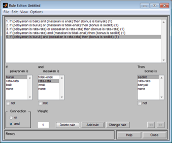 Jika telah selesai, maka terakhir kita akan membuat logika pada rule. Close terlebih dahulu Membership Function Editor. Dobel klik pada bagian tengah FIS editor. Isikan logika yang sesuai, coba skenario terbaik, terburuk dan rata-rata.
