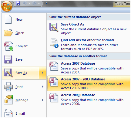 WARNING: Jangan lupa mengkonversi “SAVE AS” tipe file Access 2007 menjadi Access 2002-2003.