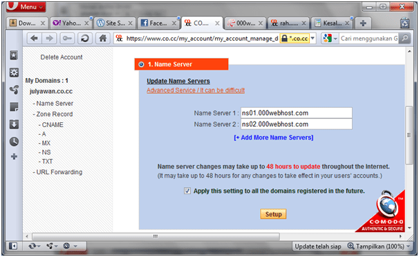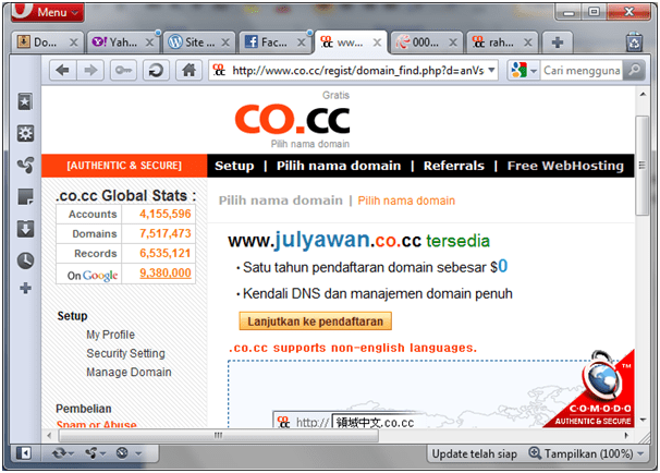 Misalnya, www.julyawan.co.cc tersedia dan gratis, maka gunakan sebagai nama domain. Klik Lanjutkan ke pendaftaran, untuk mendaftar. Setelah muncul peringatan sukses , Anda akan diminta melakukan setup terhadap domain tersebut. Klik Set Up.