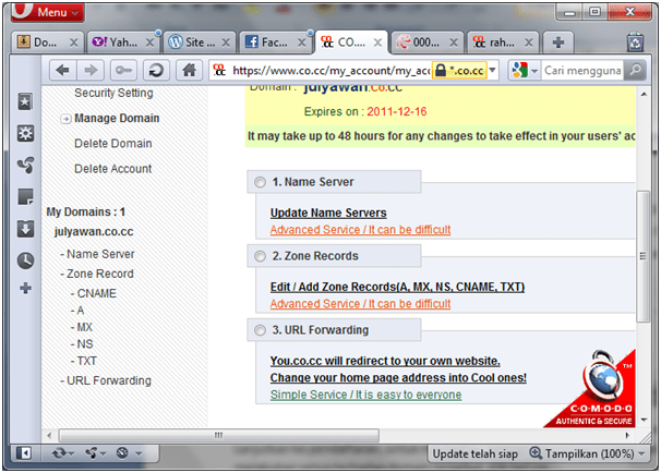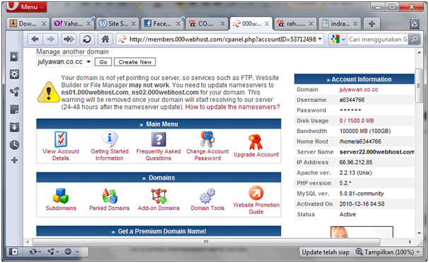 Selamat, Anda telah berhasil membuat domain name beserta hosting gratis. Coba buka www.julyawan.co.cc, apakah sudah muncul? Jika belum muncul, tunggu hingga maksimal 48 jam. Situs Anda akan aktif. Jika sudah aktif akan muncul tampilan ” Your website is up and running”, misalnya: www.mesinunisma.co.cc.