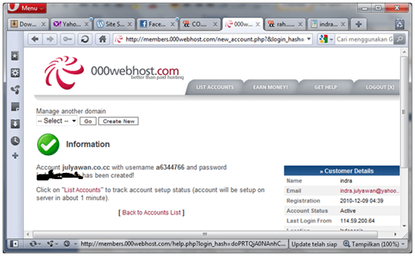Anda berhasil menghubungkan ke domain name Anda. Klik Back to Account List, maka Anda akan mendapatkan informasi domain-domain name Anda. Sebaiknya jangan lebih dari satu nama, karena Anda akan diminta bayar.