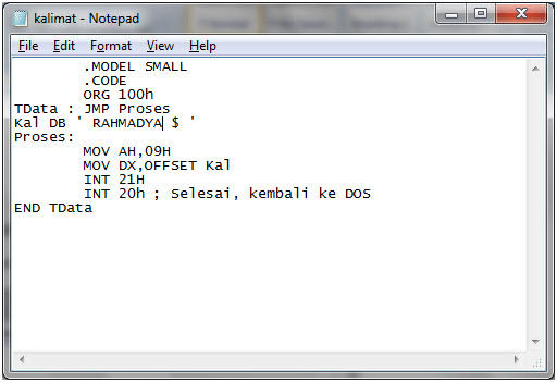 Kemudian kita akan buat dengan Turbo Assembler. Buka kembali Notepad, ketik instruksi berikut ini: