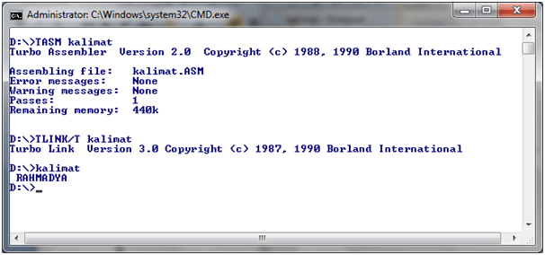Dengan Turbo Assembler, “Mov DX, 300″ diubah menjadi ” MOV DX, OFFSET Kal” dimana Kal merupakan variabel berisi data (DB) RAHMADYA. Perhatikan teknik pembuatan data “Kal Db …” dan lompatan (JUMP). Coba kompilasi dengan Turbo Assembler dan lanjutkan dengan linking.