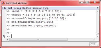 Buat suatu input = [1 2 3 4 5 6 7 8 9 10]; dan output = [1 4 9 16 25 36 49 64 81 100]; yang merupakan pangkat dari input. Untuk membuat JST dengan katakanlah dua hidden layer dengan masing-masing layer memiliki 30 neuron. Banyak istilah asing ya .. emang bikin pusing, neuron itu merupakan analogi yang dalam hal ini fungsi alih yang fungsinya meneruskan sinyal atau sebaliknya mematikan sinyal. Saatnya meramu JST, misal kita butuh neuron input sebanyak data masukan, 10 buah dan keluaran 10 buah.