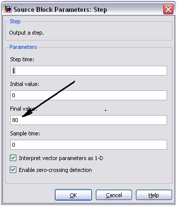 Perhatikan cara membuatnya sebagai berikut: Step didrag dari Source, begitu juga Constant. Display dan Scope diambil dari Sink. Sementara Add diambil dari Math Operation. Transfer Fcn diambil dari Continuous. Dobel klik tiap komponen untuk mengganti harga parameter. Misalnya kita ingin mengganti harga parameter Step sebagai set point yaitu 80. Isi final value dengan harga 80.