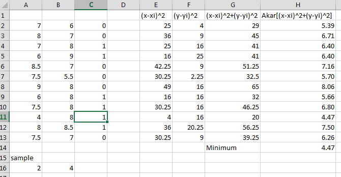 Tugas: Hitung jarak sampel (kel 1: (5,7) dan kel2 : (6,5)) terhadap data training, tentukan kelasnya berdasarkan data training tersebut (IPA atau IPS). Berikut hasil dengan Ms Excel