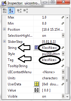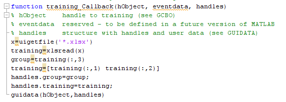 Look at the m-file above, you will see the functions according to your pushbutton and edit text. The green text will not be executed and sometimes you see “do not edit” warning. Chose the training_Callback function (see: https://rahmadya.com/2013/03/18/pengenalan-data-mining/ ):