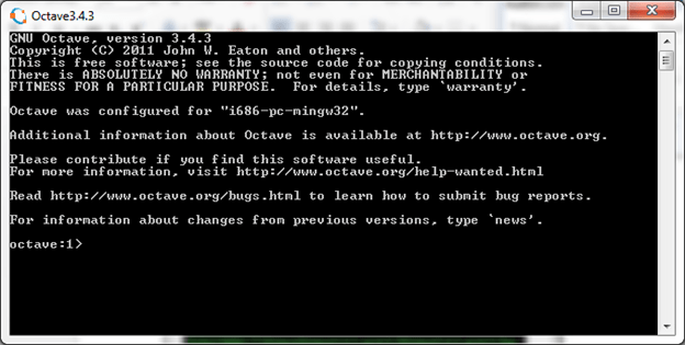 Setelah tombol FINISH ditekan, maka octave telah berhasil kita instal. Perhatikan bentuk simbol lebih besar (‘>’) yang merupakan ciri khas bahasa berbasis Matlab. Perlu diketahui, tampilan matlab pertama kali pada tahun 80-an mirim sekali dengan tampilan octave ini.
