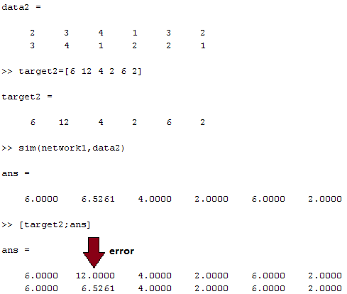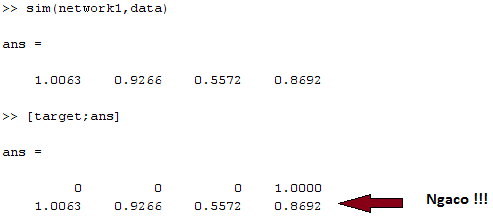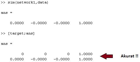 Perhatikan, ada error di kolom dua antara target dengan hasil simulasi JST. Berikutnya kita lakukan cara yang sama di Matlab 2007, apakah hasilnya lebih baik? Dengan parameter yang setara tentunya.