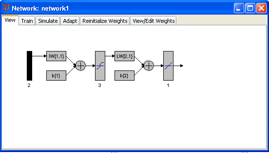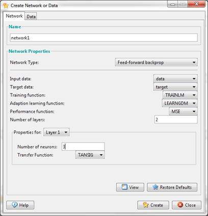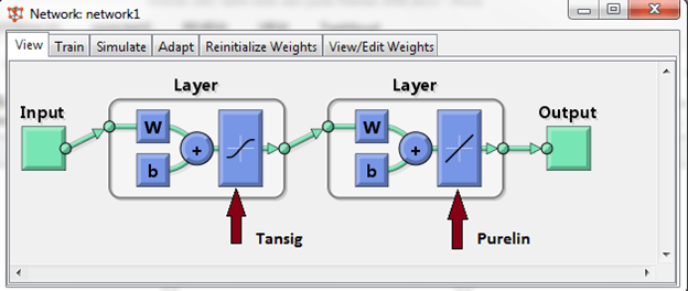 Parameter-parameter yang digunakan antara lain fungsi pembelajaran lavenberg marquadt (TRAINLM), fungsi adaptasi gradien Minimum (LEARNGDM), fungsi performa Mean Square Error (MSE), jumlah lapis 2 (satu lapis tersembunyi), jumlah neuron 3 pada lapis tersembunyi itu. Fungsi transfer yang digunakan di lapis tersembunyi adalah tangen sigmoid (TANSIG) dan lapisan output linear (PURELIN). Lakukan proses training yang dilanjutkan dengan menguji hasil pembelajaran dan data lain di luar data pelatihan.