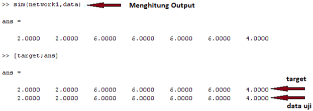 Uji terhadap data pelatihan cukup baik dan mendekatai Matlab 2008, hanya saja ada dua data yang harusnya 6 tetapi dijawab 5,9997. Tetapi tentu saja dianggap berharga 6. Sedangkan untuk data lain (data yang sama dengan uji pada Matlab 2008) dihasilkan: