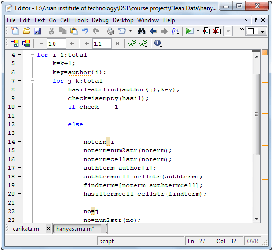 Cara kerjanya adalah pertama-tama Matlab mengambil kata kunci record pertama yaitu “ayman kaheel” sebagai term yang akan dibandingkan dengan record kedua, ketiga, dan seterusnya hingga panjang maksimal record (dalam hal ini 13 record). Jika ditemukan nama yang sama, dengan instruksi isempty, baik record term maupun yang mirip dengannya dipisahkan dalam satu tabel result. Ceritanya panjang, lebih baik langsung saya tampilkan saja kode program: