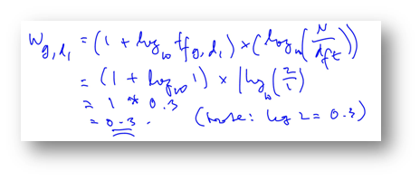 Jadi jika suatu term terdapat dalam suatu dokumen sebanyak 5 kali maka diperoleh bobot = 1 + log (5) =1.699. Tetapi jika term tidak terdapat dalam dokumen tersebut, bobotnya adalah nol.