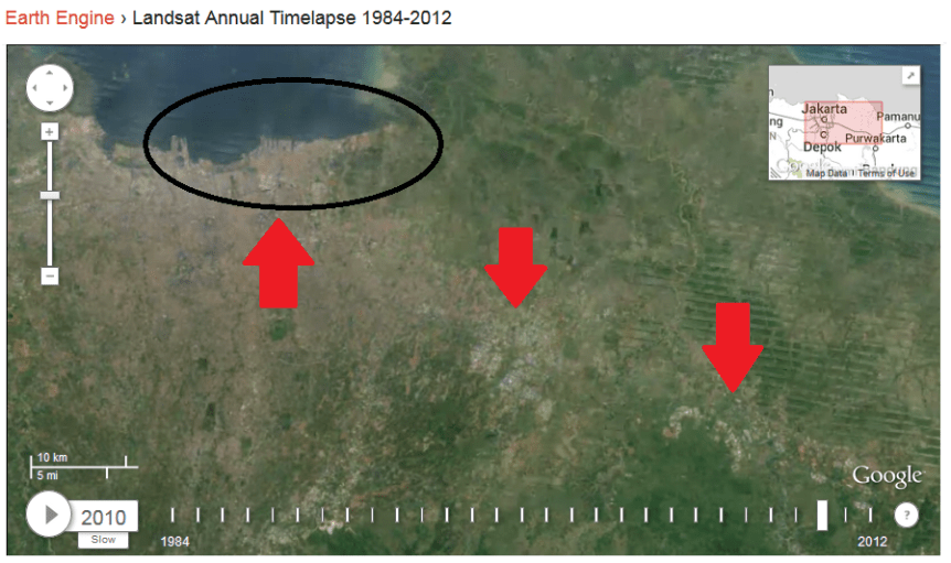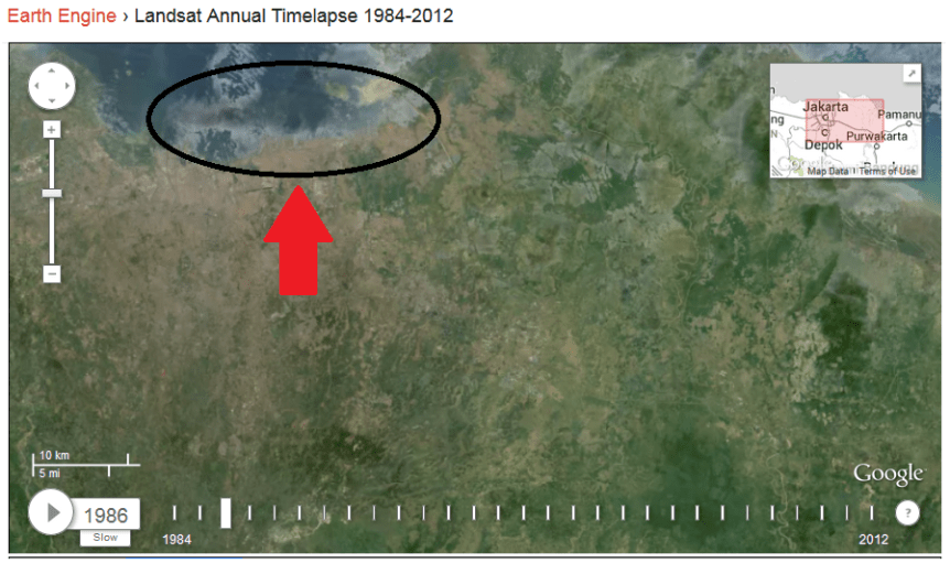 Perhatikan gambar di atas di mana pada tahun 2010 lokasi laut utara Jakarta sudah tergerus, dan memang sudah tidak lagi dijumpai pantai yang landai karena ada bendungan yang menghalangi laut yang mulai maju ke wilayah daratan. Saya ingat waktu itu ditahun 90-an ketika laut pasang air laut di pantai Ancol masuk ke jalanan dan memaksa pengelola Ancol membendung pantai sehingga saat ini tinggal beberapa wilayah saja yang masih berpantai. Perhatikan juga daerah pantai di sebelah kanan atas elips yang pada tahun 1986 tampak tetapi di tahun 2010 sudah menghilang (terpancung) menjadi lautan. Berikutnya perhatikan panah ke bawah yang menandakan penambahan pemukiman di sekitar Bekasi. Untuk wilayah hijau, Anda amati saja sendiri dengan menggeser kotak waktu (time line), hanya saja perlu teliti karena terkadang di tahun-tahun tertentu wilayah itu terhalang awan atau kekurangakuratan pemotretan.