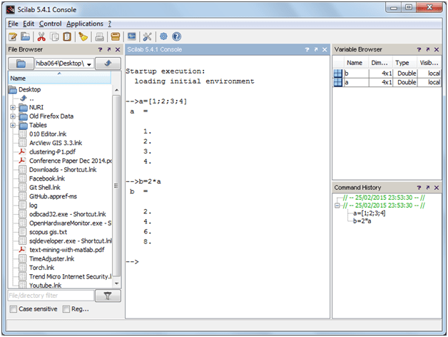 Coba dijalankan saja. Test dengan fungsi-fungsi dasarnya, apakah sama dengan matlab? Ternyata tampilan prosesnya agak jadul juga (muncul console window beberapa detik). Tampilannya, mirip-mirip juga sih dengan Scilab dan Matlab.