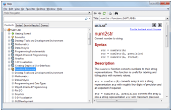 Yang menarik di sini, kita dapat mengetahui pula fungsi-fungsi yang berhubungan dengannya lewat informasi “See also”. Untuk mengetahui secara detail dalam bentuk GUI yang rapi dapat mengganti help dengan doc sebelum kata fungsi yang ingin kita ketahui lebih lanjut. Atau menekan tulisan doc num2str.