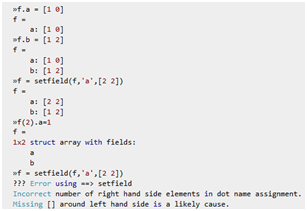 Terkadang kita tidak mengenal fungsi-fungsi tertentu, karena memang jumlahnya sangat banyak dan tidak mungkin dihapal semuanya. Nah, di sini karena yang ikut terlibat adalah programmer-programmer dengan latar belakang yang beragam, bagi programmer tertentu mungkin banyak memakai fungsi tertentu yang khas di bidangnya yang bagi orang di bidang lain masih dianggap asing. Contoh di atas adalah fungsi setfield yang masih asing bagi pemula atau yang menggunakan matlab untuk komputasi yang tidak berhubungan dengan database. Ikuti di command window saran di atas, dan berhasil. Tentu saja andalan utama kita adalah help yang resmi dari Matlab. Berikut ini trik untuk mengupdate nilai field dari data jenis struct.