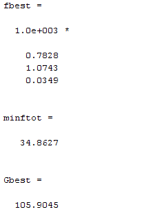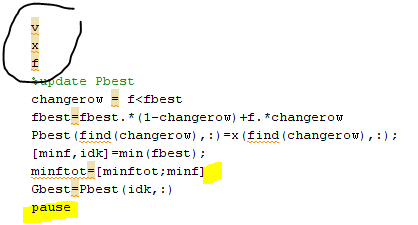 Variabel v,x,f yang menyatakan nilai awal kecepatan, swarm, dan nilai fitness-nya dimunculkan dalam variabel yang saya lingkari di atas. Untuk menampilkan nilai minimum minftot saya hapus titik komanya agar muncul di command window ketika berhenti sejenak di tiap iterasi karena instruksi pause yang saya sisipkan. Hasilnya tampak di bawah ini dimana fitness yang terbaik adalah pada swarm ketiga (34.8627) dengan swarm 105.9045. Ini tentu saja masih belum optimal karena masih iterasi pertama.