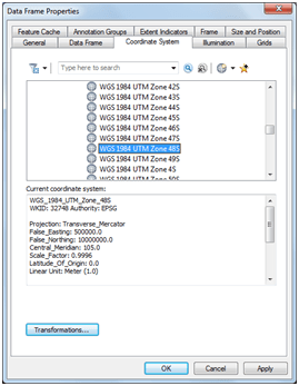Pilih proyeksi sesuai dengan lokasi agar dapat diintegrasikan dengan shapefile lainnya. Klik kanan di peta dan pilih Data Frame Properties. Ini merupakan hal penting, lihat tulisan sebelumnya.