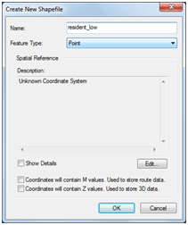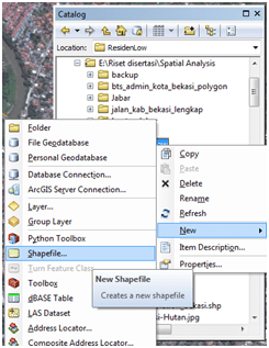 Mulai menambah satu shapefile baru untuk landuse type resident. Buat dengan format vektor titik (point vector). Cara yang dianjurkan adalah dengan menambah satu file baru di catalog dengan nama dan jenis tertentu.