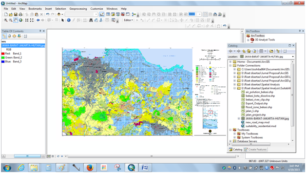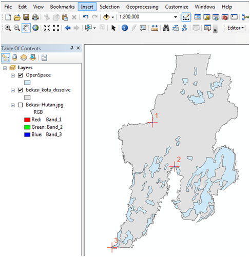 Atur dulu proyeksinya samakan dengan proyeksi kota yang telah diset sebelumnya. Setelah itu mulai proses penggambaran. Lakukan proses menggambar polygon dengan mencontek dari peta cetak yang sudah digeoreferencing, hasilnya adalah data ruang terbuka yang berada tepat di kota bekasi (berwarna biru muda).