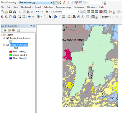 Atau kalau mau enak gambarnya dicrop aja sebesar kota bekasi. Klik kanan di menu dan aktifkan menu georeferencing. Minimal dua pasangan titik bisa membuat referensi geografis dari gambar/image tersebut. Pasangan pertama merupakan titik gambar dan titik shapefile yang sudah terproyeksi, begitu juga pasangan titik kedua. Perlu dua titik karena jika hanya satu titik, Arcgis tidak sanggup mengakuratkan hasil karena ukuran/skala yang biasanya kacau.