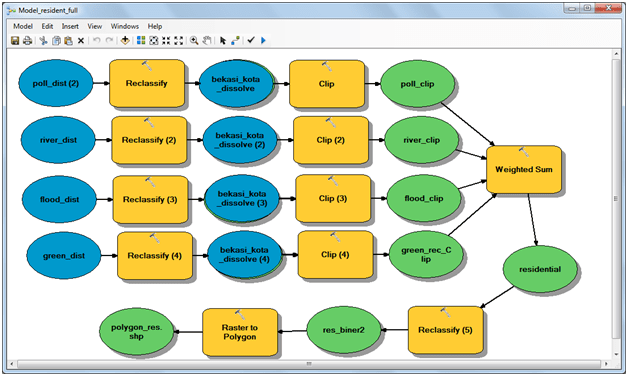 Setelah itu, jangan klik “Open” karena model tidak terlihat, melainkan pilih “Edit”. Di situlah yang menurut saya anehnya, biasanya sih klik open seperti pada Matlab. Tampak proses reclassify, clip serta raster to polygon dengan weighted sum untuk menghasilkan nilai optimal. Apa itu? Ya belajar pelan-pelan dulu ArcGIS untuk optimasinya.