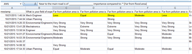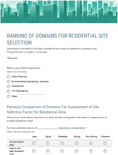 AHP biasanya dipergunakan untuk memilih pilihan yang tepat dari kriteria-kriteria tertentu. Tetapi disertasi saya hanya membutuhkan berapa bobot yang tepat untuk menentukan goal-nya nanti, tidak dengan AHP melainkan algoritma tertentu. Oke lah, saya sebar kuesioner ke beberapa responden yang mengerti masalah urban, lingkungan, atau optimasi pengalokasian lahan. Kuesioner dibuat dengan menggunakan google form.