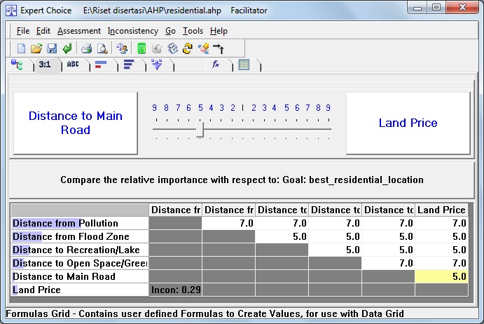 Setelah variabel-variabelnya dimasukan, isi data hasil kuesioner ke expert choice untuk mengetahui berapa bobot yang diperoleh berdasarkan jawaban dari responden. Berikutnya adalah mengisi data dari hasil kuesioner yang disebar. Tekan simbol 3:1 untuk mengisi pairwise comparison.