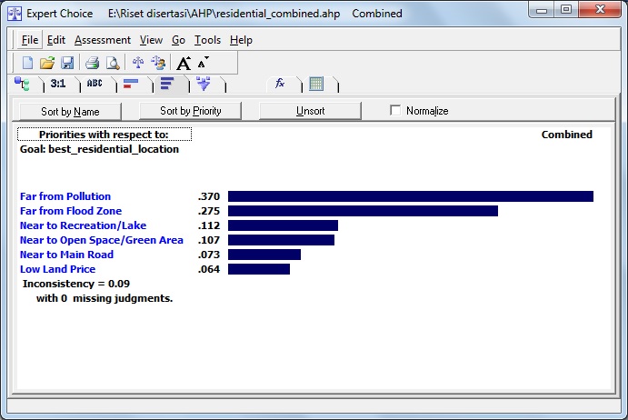 Combine data Anda baik (both data and judgment) untuk menghasilkan total bobot seperti gambar di atas. Dan coba jangan sampai inconsistency di atas 0.1, jika lebih buang yang scor inconsistency-nya buruk (tapi jangan utak-atik data ya, karena melanggar prinsip riset ilmiah – namanya fabrikasi). Karena Expert choice, maka tidak perlu data sampel yang banyak, tetapi yang mengisi adalah pakar di bidangnya.