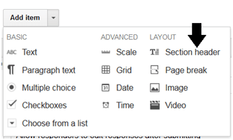 Jika ingin membuat tulisan saja, misalnya judul atau penjelasan dapat dengan memilih Section Header. Berikutnya jika berupa multiple choice tinggal pilih jenis pertanyaannya. Jika tidak pilih yang sesuai.