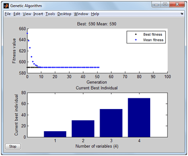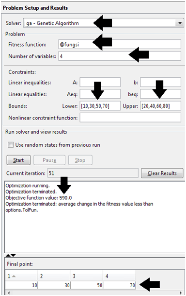 Setelah memilih jenis optimasinya (GAs), isi nama fungsi didahului @, jumlah variabel (4 variabel) dan perhatikan teknik mengisi bound yang sesuai persoalan. Di bagian kanan masih ada sebenarnya, tapi ga wajib. Centang pada isian plotting pada best fitness dan best individual sehingga ketika tombol “Start” ditekan, proses optimasi akan disertai pergerakan grafik yang interaktif. Oiya, tolong dicek benar atau tidak kalau itu nilai minimum. He he .. kayaknya ga perlu pake GAs saya juga bisa nebak, ya pasti batas bawah lah jawabannya (10, 30, 50, dan 70) soalnya fungsi kuadrat (membesar terus). Coba ganti fungsi yang lain.