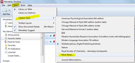 Berikutnya adalah cara mengimpor style baru dari Zotero ke Mendeley. Buka Mendeley Desktop yang telah kita install masuk ke view – Citation Style – More Style.