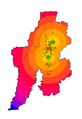 Perhatikan dua titik center itu sudah muncul di peta bekasi, dan karena proyeksi mengikuti wadahnya, maka tepat berada di lokasi yang di tuju di dalam wilayah bekasi. Kalo pengen membuat jangakauannya, bisa dengan teknik euclidean distance seperti postingan sebelumnya. Keren ya, Matlab bisa ke mana aja penggunaannya.