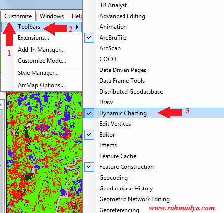 2. Setelah menekan tombol OK buka ArcGIS dan perhatikan apakah Add-in sudah muncul di menu ArcGIS. Jika belum muncul, jangan khawatir, masuk ke menu Customize – Toolbars, lalu ceklis Dynamic Charting.