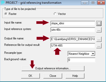 Fill the input and output file with their reference system (e.g. UTM-48S). The output reference information is important to match the number of column and row. Click this tab and use your reference image.