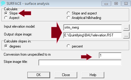 Chose the images to be cropped and the name and location of output image. Fill upper left and right as well as lower left and right. But if you have already a study area map, chose this map in “An existing windowed image” and then press OK. To create slope from the elevation map, use Slope function (just type “slope” in searching menu in IDRISI).