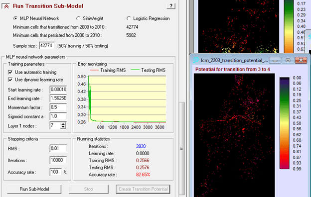 Penerapan yang mencolok adalah pada bidang perencanaan. Di sini suatu model biasanya dibentuk dengan dua metode yaitu logistic regression dan JST. Salah satu keunggulan JST adalah karakteristiknya yang mampu menangani data non-linear, sementara logistic regression harus melinearkan data terlebih dahulu dalam bentuk logaritmik. IDRISI memanfaatkan JST dalam salah satu modelnya (LCM) untuk melatih model terhadap suatu perubahan. Jadi data spasial sangat berkaitan dengan data temporal. Gambar berikut contoh hasil training dengan JST, yang disebut di aplikasi itu dengan nama multi-layer perceptron (MLP) neural network.