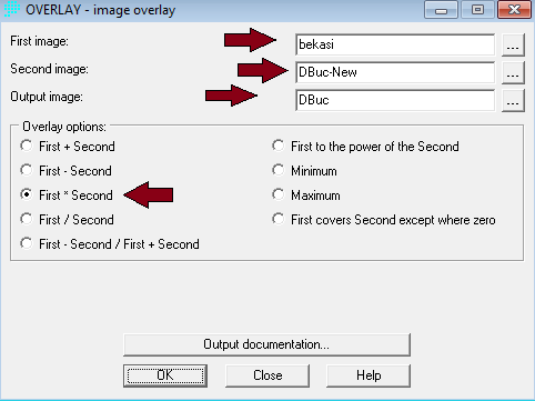 Input the first, second, and output image for overlaying calculation. Choose first * second for multiplying first with the second image. It seems easy, but in the implementation users must consider many things, e.g. the projection and extent between first and second images. Use “Metadata” to match both images.