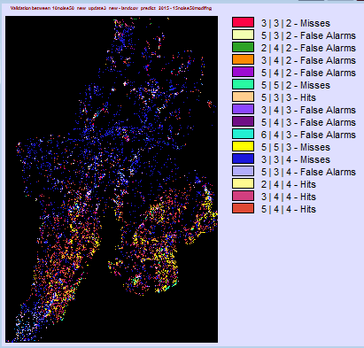 In Land Change Modeller, two predictions are: change and persistence. For example if we predict that a location in 2015 is change, but actually not, it is called False alarm. Instead of true and false, the Misses, False alarms, and Hits are used. The explanation from IDRISI site: