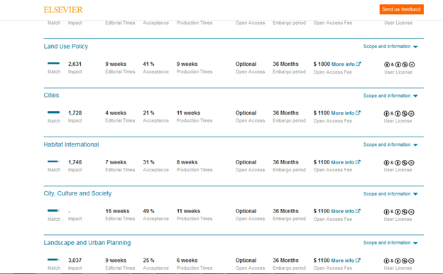 Setelah ditekan “Find Journal’ maka muncul daftar/list jurnal yang cocok. Tampak salah satu targeted jurnal saya, “Habitat Internasional”, yang ternyata ada option untuk berbayarnya. Hmm, silahkan mencoba. Tetapi apakah aman? Karena khawatir abstract dan judul kita terekam di Elsevier, semoga saja aman. Toh itu hanya abstract.