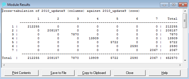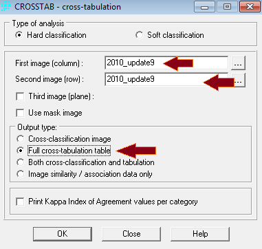 Untuk data polygon, postingan yang lalu sedikit mengulas bagaimana menghitung suatu area tertentu dalam software ArcGIS. Untuk menghitung area, cara yang praktis adalah dengan menggunakan “crostab” di IDRISI atau “tabulate area” di ArcGIS. Prinsip penggunaannya baik ArcGIS maupun IDRISI sama saja. Tabulasikan saja dua image yang sama.