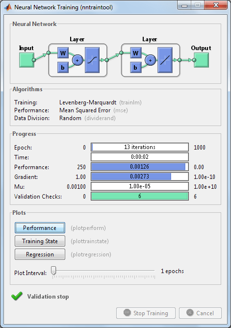 Agar lebih gampang, contoh training dapat dilihat di help matlab (ketik saja help newff di command window Matlab). Atau copas script berikut ini: