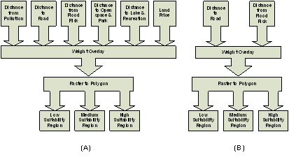 Figure 6: Spatial analysis using weighted overlay technique to create suitability regions for scoring residential area (A), and commercial, industrial, health, and education (B).