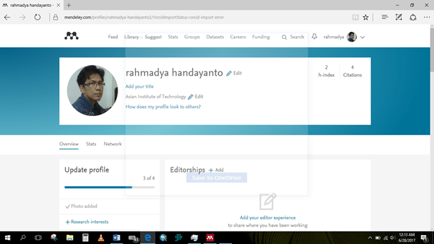 Ada pilihan apakah mengimpor data dari ORCID atau hanya sekedar memunculkan ID ORCID. Sebelumnya terlebih dahulu Anda diminta login ke ORCID dengan login yang telah dibuat sebelumnya. Sepertinya Mendeley sudah mendaftarkan peneliti-peneliti yang memiliki ID Scopus apakah yang bersangkutan sudah membuat atau tidak. Ciri-cirinya jika si peneliti sudah mendaftar maka akan muncul tombol “follow”, misalnya beberapa Co-author saya ada yang sudah mendaftar ada juga yang belum.